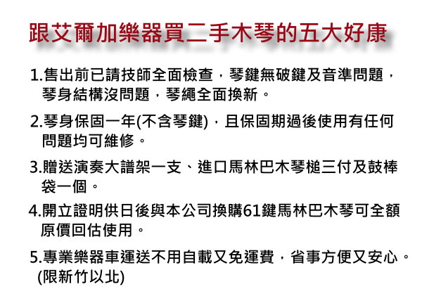 購買後日後若要與本公司換購全新61鍵以上之馬林巴木琴