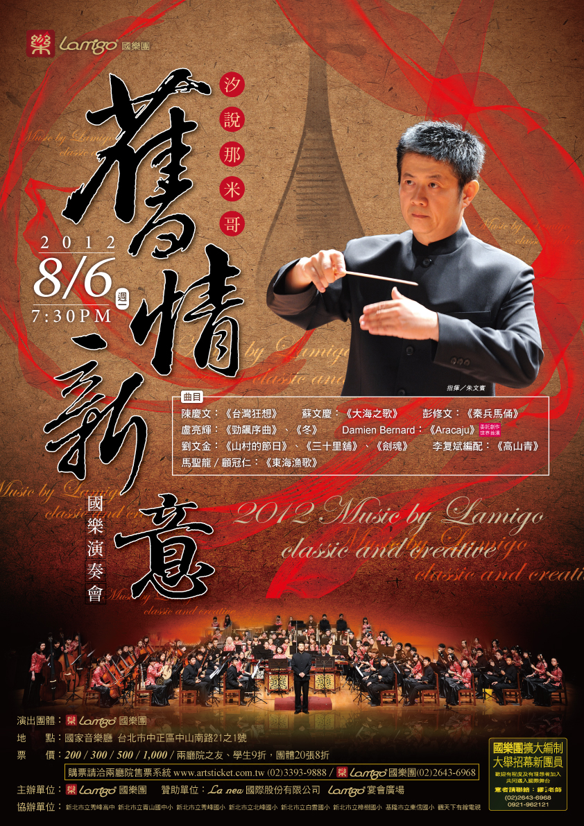 本團為累積近三十年演奏、指揮、教學經驗的國樂家朱文賓先生,由於對國樂的熱忱自己花了一筆經費,並有幸獲得La new國際股份有限公司的贊助順利於2010年10月組成Lamigo國樂團,團員有音樂科系畢業的演奏家及音樂科班的在校大學生、高中生,社團之國樂好手、國中之精英,大部份都曾是音樂比賽第一名或名列前茅的高手,並於2011年6月10日在基隆文化中心首演【快樂首航音樂會】,觀眾爆滿,非常成功。此次於國家音樂廳演出,除重新演繹山村的節日、秦兵馬俑、東海漁歌﹍等經典名曲之外,更委託作曲家Damien Bernard老師創作壹首新作品,並演奏蘇文慶老師、盧亮輝老師及陳慶文老師三位大師膾炙人口的作品,節目精彩可期懇請捧場聆聽。謝謝!